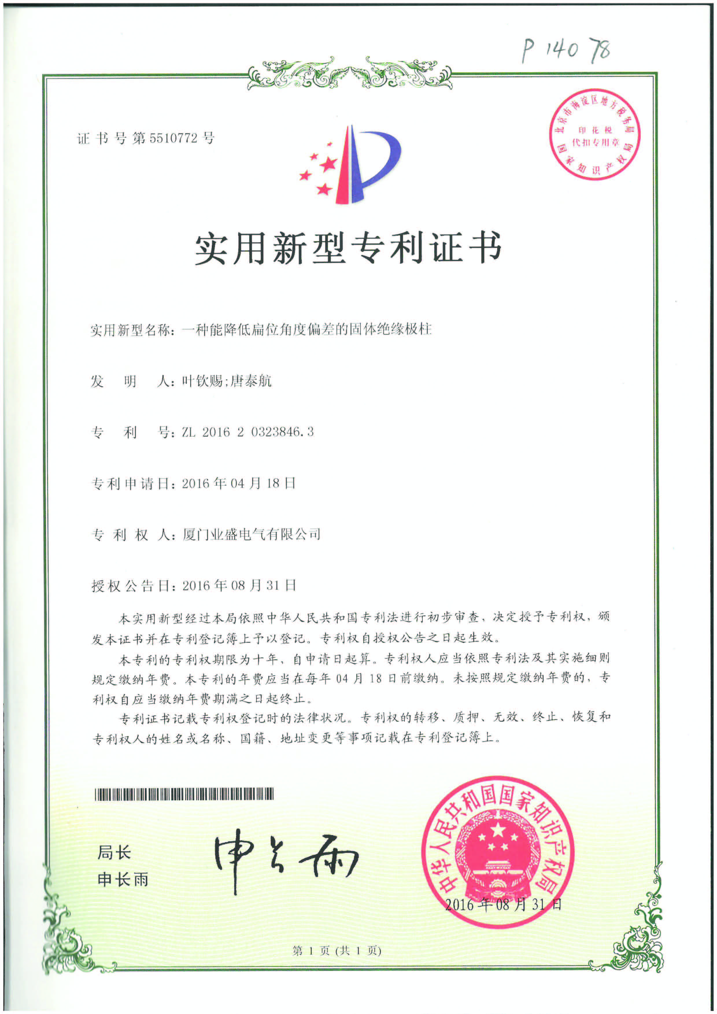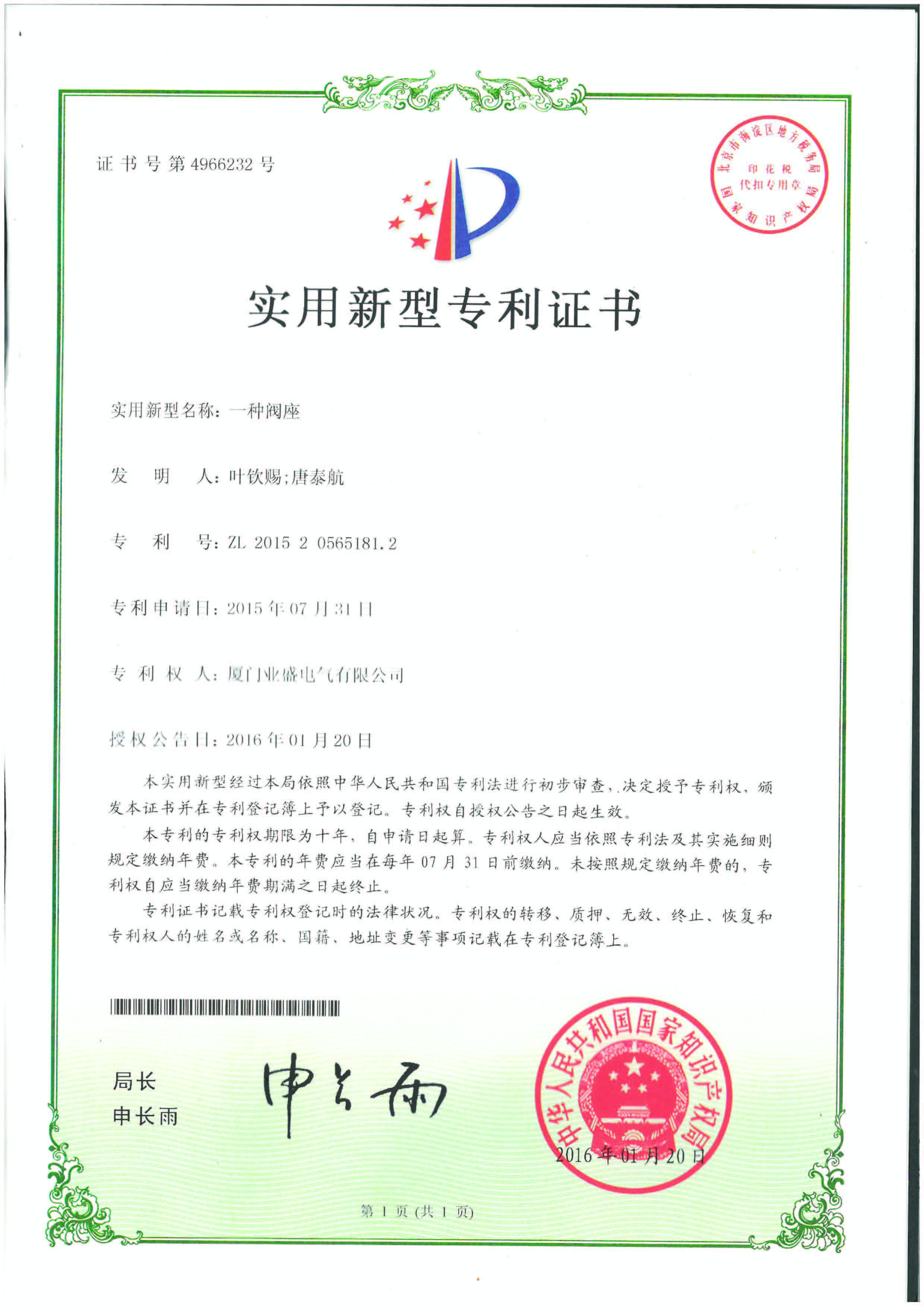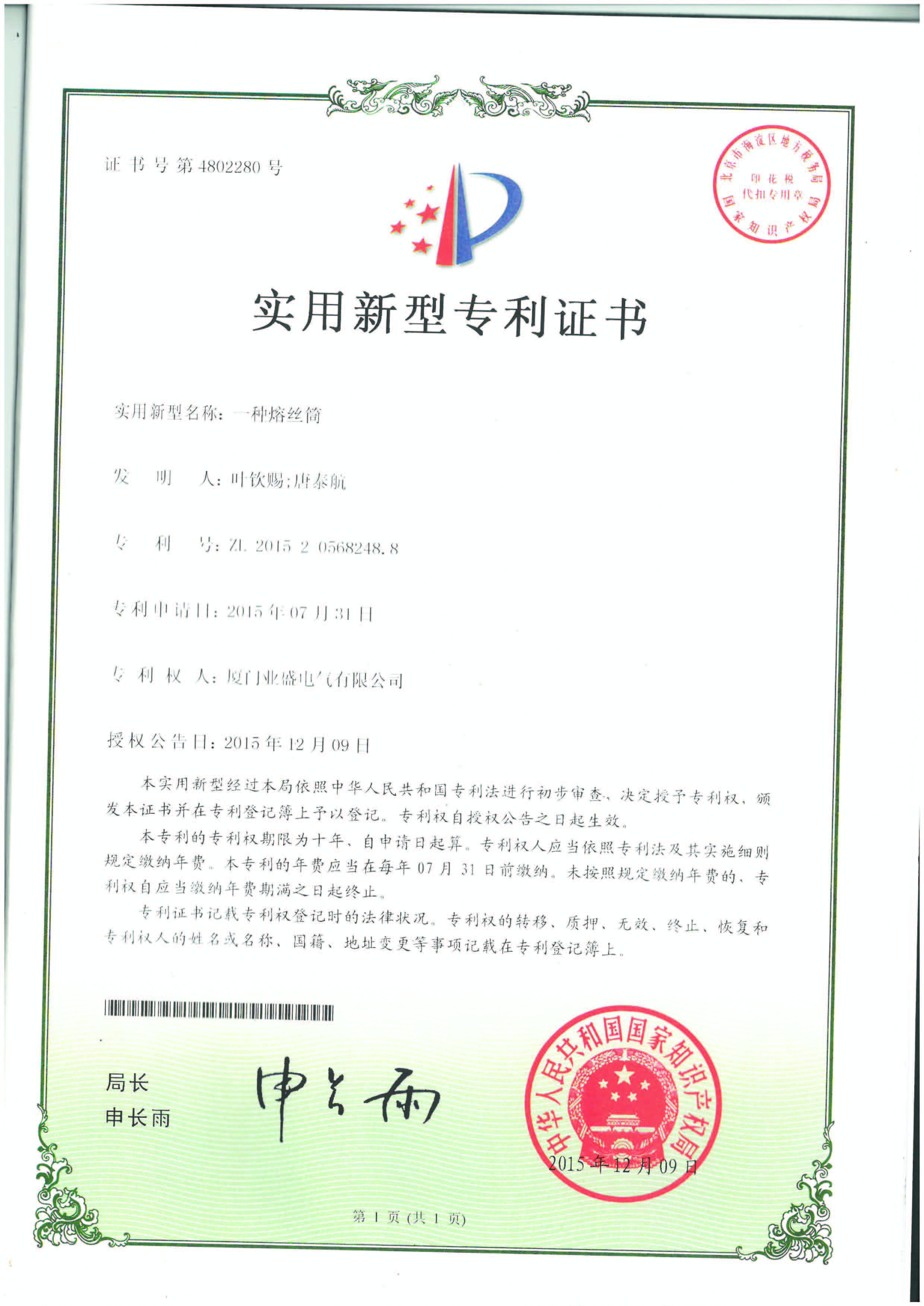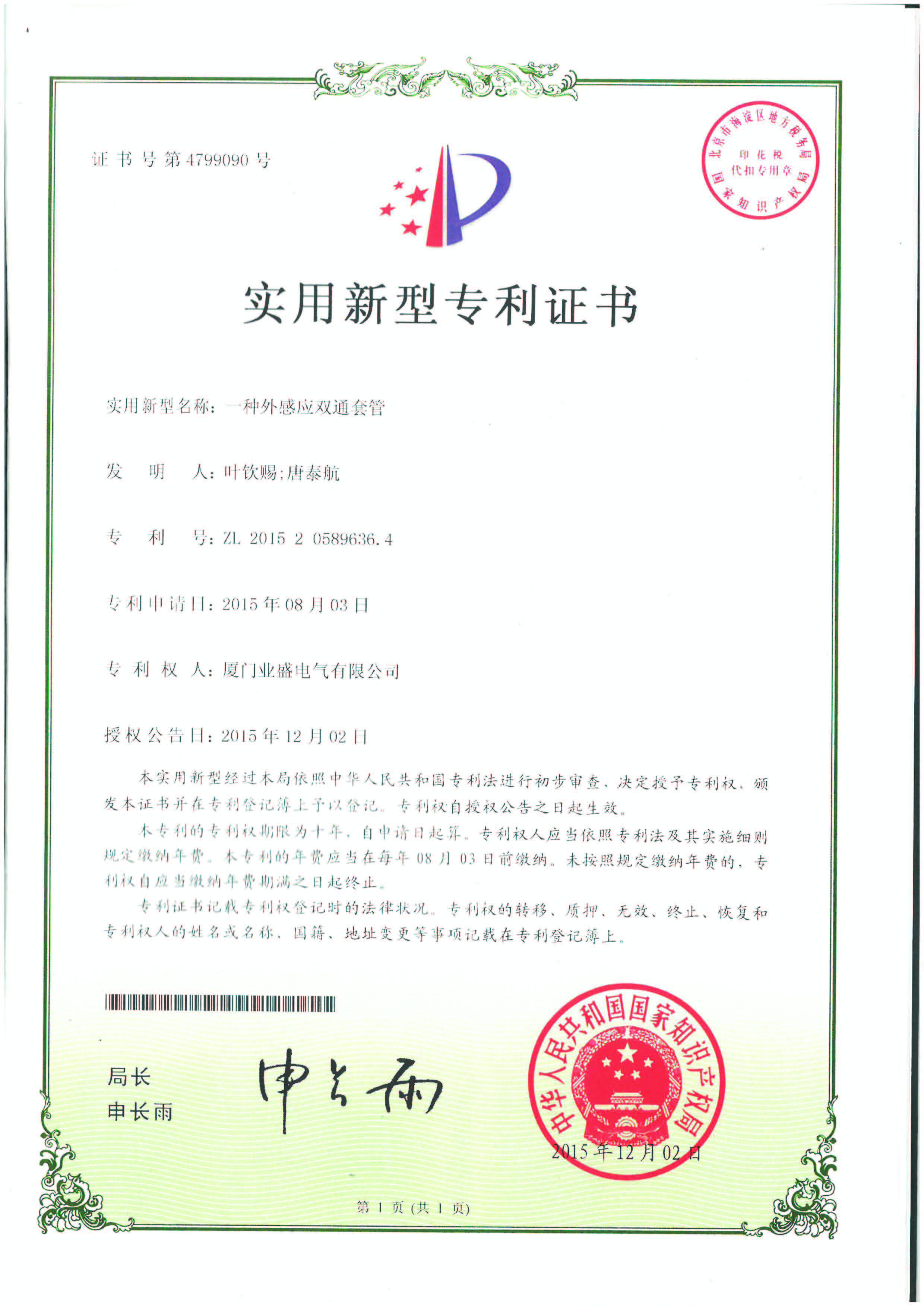 實用新型專利證書